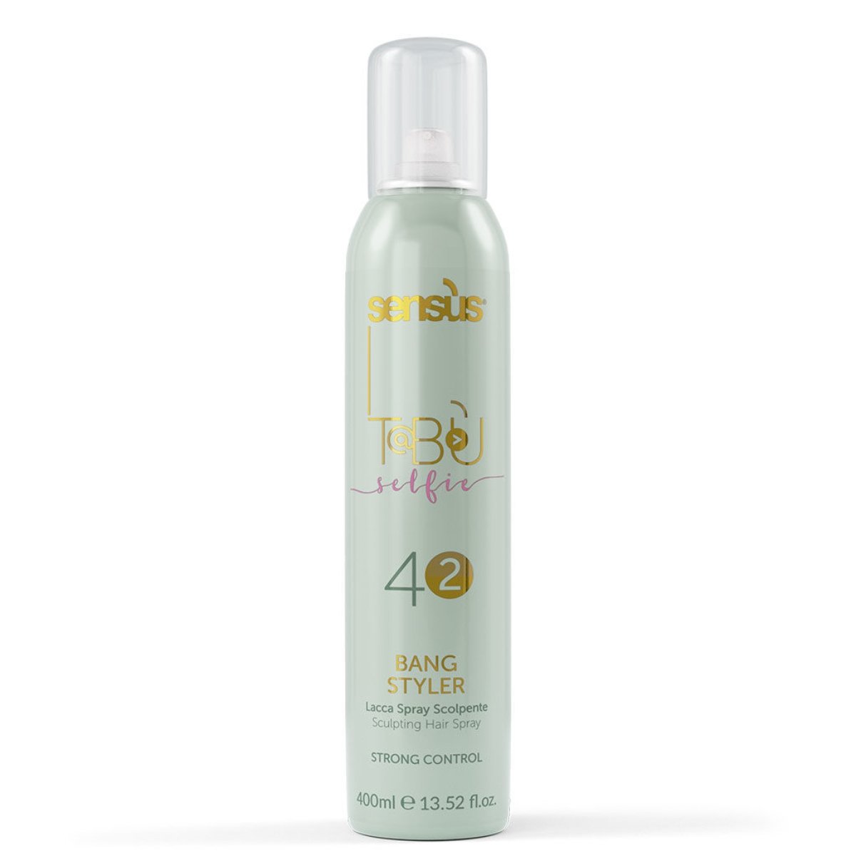 Bang Styler 42 é um spray fixador de fixação forte (Control 4) com brilho natural/moderado (Shine 2), formulado para manter o penteado no lugar, com acabamento acetinado e efeito de volume.