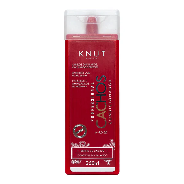 O condicionador Knut Cachos, foi desenvolvida para cabelos ondulados e cacheados naturais ou com química, com a mais alta tecnologia cosmética. Contém colágeno pró V, uma proteína essencial para manter os cachos controlados, reduzindo o frizz e o volume, e aminoácidos de arginina deixando os cabelos cacheados ainda mais hidratados, macios, maleáveis e com um balanço incrível.
