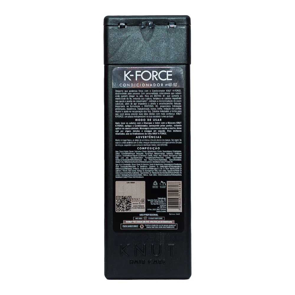 Desperte sua poderosa força com o condicionador K-Force, desenvolvido para pessoas com personalidade determinada, que sabem onde querem chegar na vida. Rico em BIOTINA B1, a vitamina da força, e PANTENOL B5, a vitamina da elasticidade, elementos que vão deixar seus cabelos limpos, hidratados e fortes para que você possa encarar suas lutas diárias com mais confiança. Knut K-FORCE: um aliado indispensável na sua escalada rumo ao topo.