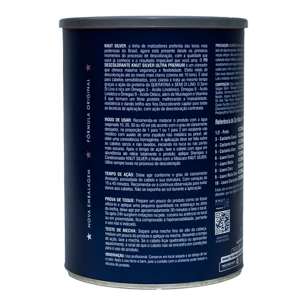 O Pó Descolorante Knut Silver Ultra Premium 300g foi especialmente desenvolvido para a descoloração dos cabelos danificados, podendo ser usado em todas as técnicas de aplicação. É um clareador que oferece máxima segurança e flexibilidade. Efeito nítido de descoloração clareando até 10 tons. Além disso, combina agentes descolorantes e substâncias de tratamento cosmético como aminoácido, que penetram na fibra capilar promovendo brilho e resistência aos fios.